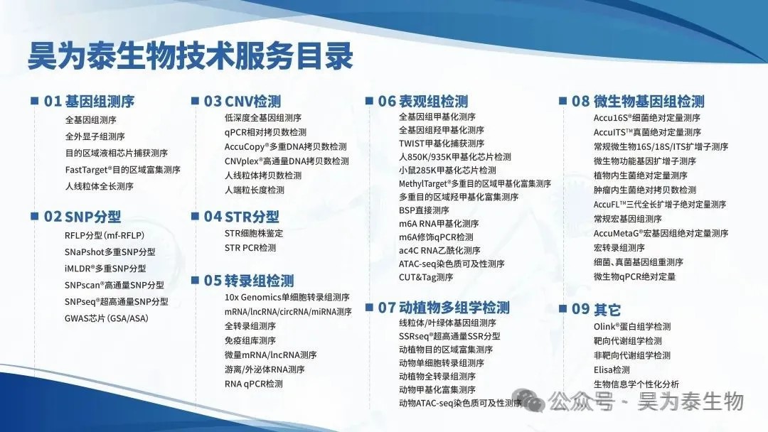 昊为泰生物多年专注于深耕遗传学和基因组学等领域科研特色技术的开发,不断跟进国际先进的科研成果及技术发展,创新研发了许多特色专利技术和领域内前沿的检测服务项目,受到广大专业科研用户的认可和好评。